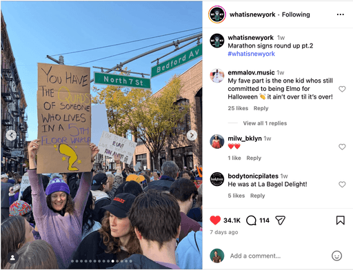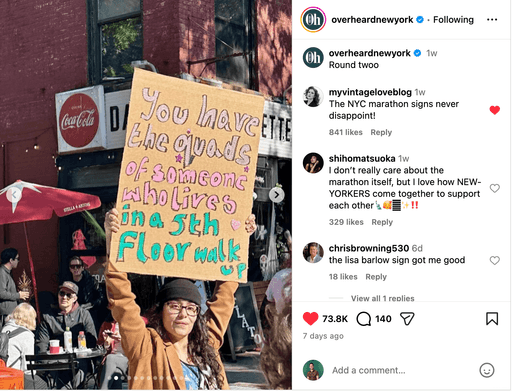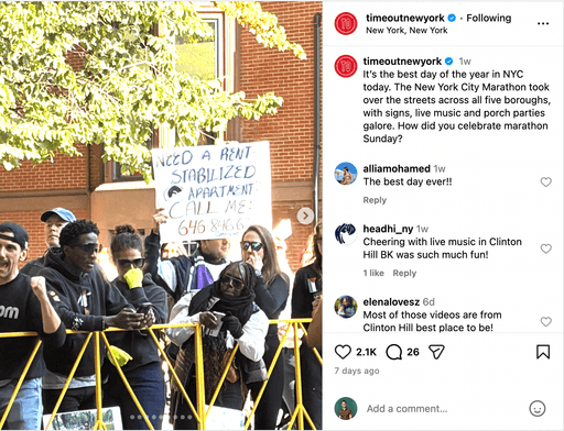 The takeover felt organic (not advertising) and spread quickly. Spectators began posting the signs in real time, generating hundreds of UGC posts across Instagram and TikTok. Major local culture accounts including Time Out NY, Overheard in NY, and What Is New York? amplified the campaign further, leading to millions of earned impressions within 48 hours, followed by coverage in the ad trades. The QR codes and phone number drove hundreds of map visits from renters actively seeking apartments.